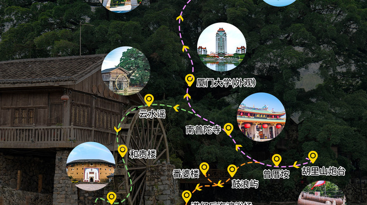 - 缤纷景点:【🥰参考行程】 D1:各地-厦门:抵达厦门—专车接机/站—酒店 D2:厦门-漳州:南靖云水谣土楼—和贵楼—怀远楼—土楼之光(钟兴楼登楼观全景)-漳州古城citywalk D3:厦门-鼓浪屿:世遗海上明珠—万国建筑博览—菽庄花园—钢琴博物馆—港仔后海滨浴场 D4:南普陀寺—厦门大学(外观)—沙坡尾艺术西区—演武大桥观景平台—胡里山炮台—环岛路/一国两制沙滩(自由海滨沙滩娱乐) D5:自由活动-送机/站 -----更多详情点击下方【行程】-查看每日详细行程介绍-----