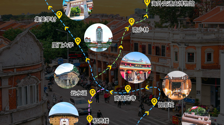 - :【缤纷景点🥰参考行程】 D1:抵达厦门-专车接机/接站-酒店-自由活动(赠海上明珠观光塔-自行前往) D2:厦门-泉州:南少林寺-泉州非遗博物馆-含午餐50元-开元寺-西街-蟳埔村(簪花体验) D3:厦门-漳州:南靖云水谣土楼:和贵楼+怀远楼+土楼之光-含午餐50元-漳州古城Citywalk(自由活动) D4:南普陀寺-厦门大学(外观)-鼓浪屿-含午餐50元-鼓声洞-大德记海滨浴场-皓月园-万国建筑博览-龙头路 D5:集美学村-五缘湾帆船出海-环岛路/玩月坡/一国两制沙滩-曾厝垵 D6:自由活动-送机/站 -----更多详情点击下方【行程】-查看每日详细行程介绍-----