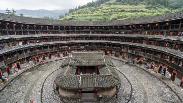 怀远楼建于1905-1909年,是目前建筑工艺精美、保护好的双环圆形土楼。楼高四层13米,直径38米,每层34间,共136间,为简氏家族所建。怀远楼引人注目之处在于内院核心位置的祖堂,也就是家族子弟读书的地方“斯是室”。“斯是室”精巧秀气,上下堂建筑占地190平方米,室内雕梁画栋,古朴天然,书卷气浓。怀远楼为二环楼,建筑师是振成楼的建筑师,楼的设计相当工整。楼内有块何应钦赠送的金匾“助我义师”,楼前平地有块用鹅卵石排成的太极图案。土楼和村子被水稻田和茶山包围着,一幅安宁的田园图。怀远楼的楼基用巨型鹅卵石和三合土垒筑3米多高,墙体至今光滑无剥落。站在楼外墙边把脸贴着墙向上看,能看到楼基下围小,中间大,上层又逐渐缩小,好象橄榄状,此结构符合力学,可抗风,使楼更结实。地址:福建省漳州市南靖县坎下村上南43号