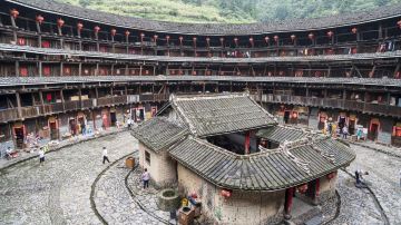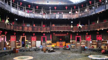 整个景区壮观的应该是5层楼高的和贵楼,它是较大的方形土楼,令人诧异的是它是建在沼泽地之上的。中庭有一块下陷的鹅卵石地面,长期潮湿,人站在上面踩一踩就能感觉到地面的上下摇动。需要注意的是,如果你想要上楼,需要另外支付5元,并且这里的商业气息很浓重,各种小摊挤的满满当当。