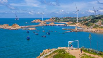长江澳沙滩是平潭三大海滨沙滩之一,沙质细白。拥有福建较大规模的风力发电田,一座座风车排列得错落有致,碧海风车和蓝天白云,美不胜收。
