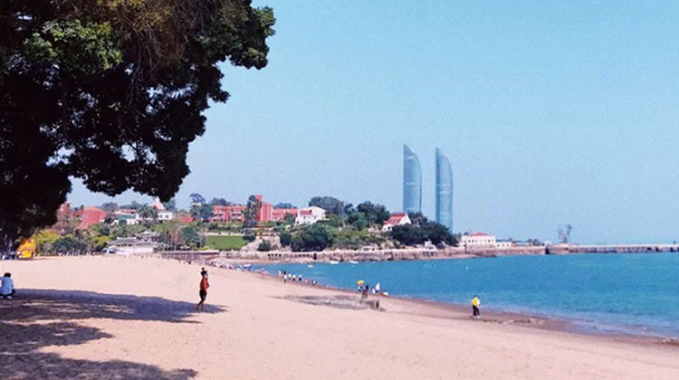港仔后沙滩位于菽庄花园西面,两者毗连在一起。港仔后的海面又名金带水。站在沙滩上,面朝大海,背面就是日光岩,可以看到高处光秃秃的岩石,所以这里风景还是很美的。这里又是一个人群聚集区,很多人是来游玩菽庄花园的,正巧这里有个浴场,便下来用海水泡泡脚也不错。