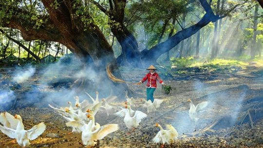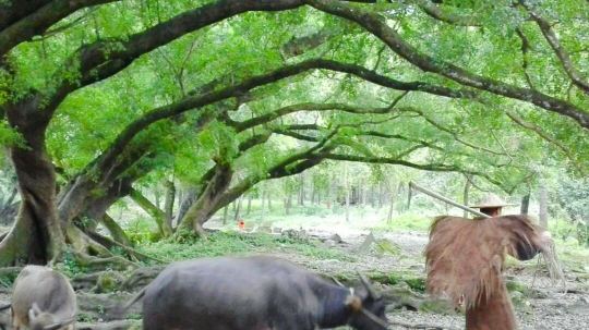 在这里像极了桃花源里面的隐世村落。千年大榕树下,村民牵着牛赶着鸭子挑着水, 仿佛不问世事,一个纤尘不染的“海国桃源”。早一点到的话,这里的雾气还没有散尽,不会太浓就薄薄的一层飘在树林中。当第一缕阳光穿透千年榕树下时,美的就像是一首诗。