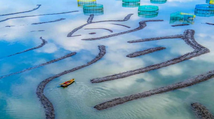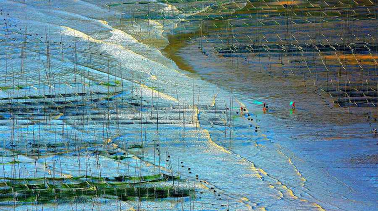 霞浦县松港街道北岐村海边风光如画,影友如织。北岐滩涂风光旖旎,成为22大摄影地之一,每年前来拍摄滩涂风光的国内外影友多达20多万人次。每当北岐紫菜生产的繁忙季节,滩涂上万根竹竿插成一块块方形的网框,由远及近,绵延数十里,蔚为大观。清晨六点左右,一轮火球从海面上喷薄而出,瞬间,大海像镀上了一层金色霞衣,上百米的山道上,摄影师们屏住了呼吸,“咔嚓、咔嚓”声响成一片,紫菜在丝网上挂着一条条色带,红的,黑的,紫的,宛如一幅没有经过修饰的水墨画,被收入一个个镜头,被曝光在一张张彩色胶片上。