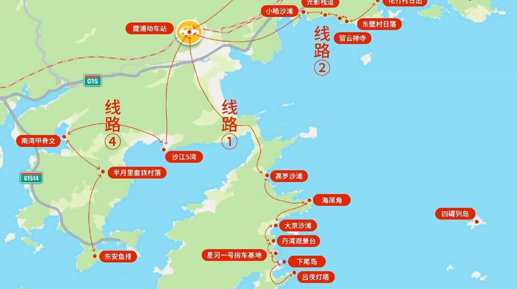 默认安排南线【南线】北岐滩涂日出>高罗沙滩>大京沙滩>东海一号观光步道>丹湾观景台>闾峡灯塔>下尾岛