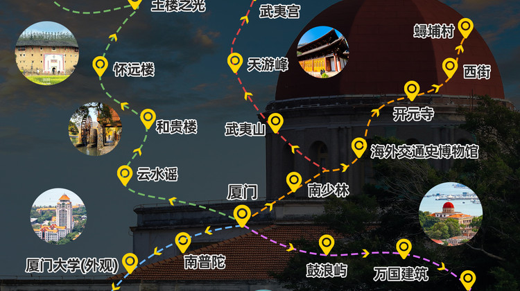- :【行程速览⭐】 D1:抵达厦门-接机/站-自由活动 D2:厦门-泉州:南少林—泉州海外交通史博物馆(含金牌讲解员精讲)—开元寺—西街—蟳埔村(赠簪花)(含午餐) D3:厦门-漳州:南靖云水谣土楼—和贵楼—怀远楼—土楼之光(登楼观全景)-非遗手作体验-漳州古城citywalk(含午餐) D4:厦门-鼓浪屿:世遗海上明珠—万国建筑博览—菽庄花园—钢琴博物馆—港仔后海滨浴场 D5:南普陀寺—厦门大学(外观)—沙坡尾艺术西区—演武大桥观景平台—胡里山炮台—环岛路/一国两制沙滩(自由海滨沙滩娱乐)—乘车前往武夷山 D6:厦门-武夷山:天游峰—九曲溪竹筏漂流—武夷宫(含午晚餐) D7:武夷山-福州:玉女峰—一线天—大红袍景区—品茶—乘坐高铁前往福州(含午餐) D8:二选一:福州自由行(送机/站)或【福州-平潭】8人拼小团不含导:北部湾生态长廊长江澳风车田-镜沙-北港村-东海仙境“仙人井” -----更多详情点击下方【行程】-查看每日详细行程介绍-----
