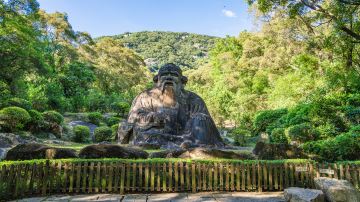 道教老君岩为中国大的道教石雕,位于泉州市丰泽区清源山主景区内,为全国重点文物保护单位。老君岩雕于宋代,据《泉州府志》记载:“石像天成,好事者为略施雕琢。”寥寥数语,使之更具有神秘色彩。石像高5.1米,厚7.2米,宽7.3米,席地面积为55平方米。石像头戴风帽,额纹清晰,两眼平视,鼻梁高突,右耳垂肩,苍髯飞动,脸含笑容,左手依膝,右手凭几,食指与小指微前倾,似能弹物,背屏青山,巍然端坐,更显空山幽谷,离绝尘世。头、额、眼、髭、须等细雕刻独具匠心。整个石像衣褶分明,刀法线条柔而力,手法精致,夸张而不失其意,浑然一体,毫无多余痕迹。逼真生动的表现了老人慈祥、安乐的神态,因而成了一种健康长寿的象征。