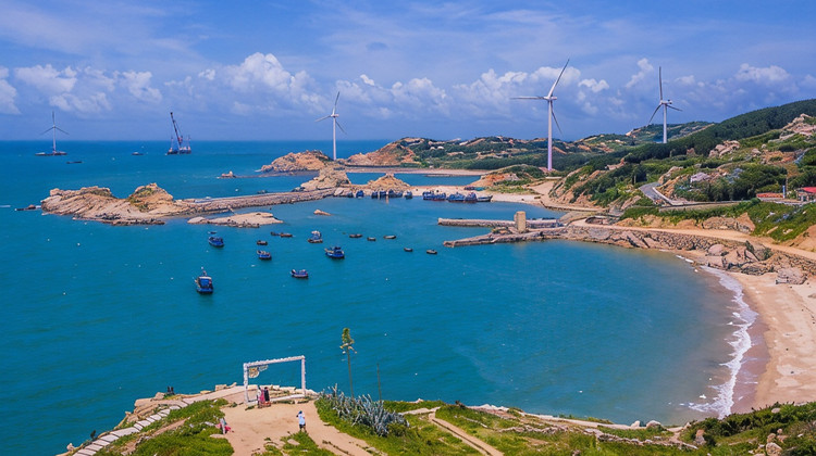 长江澳海滩是平潭三大海滨沙滩之一,沙质细白。拥有福建较大规模的风力发电田,一座座风车排列得错落有致,碧海风车和蓝天白云,美不胜收。