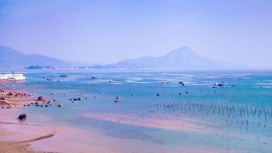 小皓沙滩的海岸线曲折,沙滩上有许多树枝形状的小水道,与海面上的竹棚相互呼应。在退潮时,还可以看到渔民赶海的场景,以及小鱼、小虾、小螃蟹等生物。